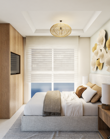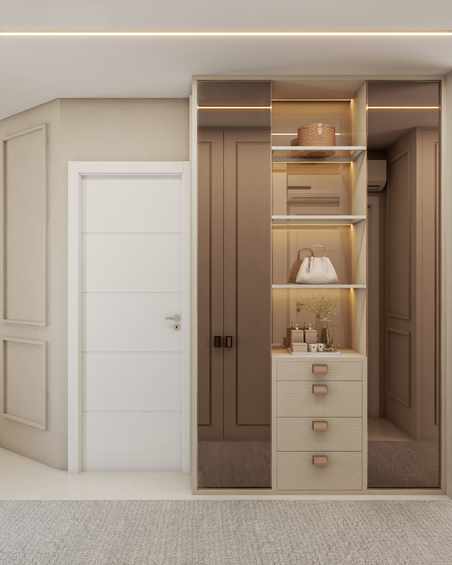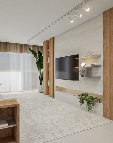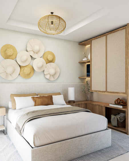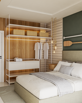 Este apartamento é uma celebração da vida à beira-mar, onde o conforto e a elegância se encontram em um projeto repleto de elementos que remetem ao mar e a praia. Originalmente ele contava com 4 suites, transformamos em uma master + duas de visitas, para que pudessemos adicionar um closet maior à suite principal. A cliente tinha algumas peças antigas de mobiliário solto que pertenciam aos avós, cheios de memorias afetivas, então os tomamos como partido para o desenho de alguns ambientes. Aqui os elementos naturais/ cores que remetem a natureza foram nosso principal partido.